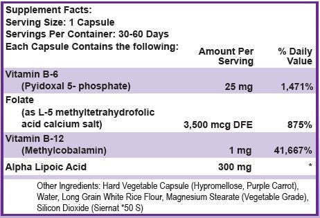 Nufola Active Ingredients: 25mg Vitamin B-6 (Pyridoxal 5-phosphate), 3.5mg Folate (L-5-methyltetrahydrofolic acid calcium salt),1mg Vitamin B-12 (methylcobalamin), 300mg Alpha Lipoic Acid